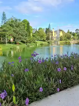 🏞️ There's a small lake with a romantic wooden bridge.