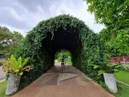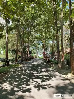 The atmosphere is shady and the walkways are lined with trees.
