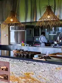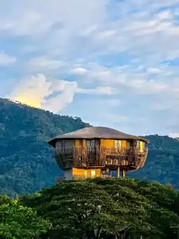 The restaurant is located on the top floor of an Asili Tree, 25 meters above the ground, creating a "bird's nest in the jungle" atmosphere with a 360° view of Khao Yai.