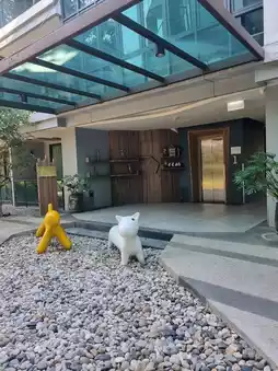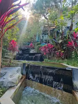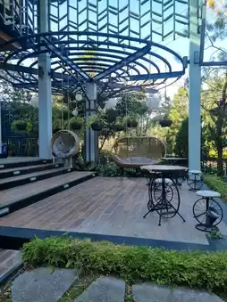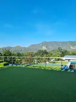 In the common areas, there are stairs leading up to the rooftop deck, which is covered with artificial grass and offers stunning views of the hotel's mountains. The common area features a long swimming pool, suitable for both children and adults. The hotel boasts a lush green garden, providing shade along the common area's walkways, and plenty of photo opportunities.