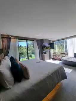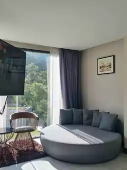 Inside the room, a separate bathroom is located on the right, while a wardrobe and work desk are located on the left. Next to the work desk is a king-size bed with several pillows. The room's décor features wood-pattern tiles, while the walls are minimalist white with a dark green accent at the headboard. There's also a large round sofa for lounging and a small dining table. A highlight of the room is the large windows on both sides, allowing for full light, and the view of the hotel's mountain backdrop provides a truly natural experience. This room has a balcony with a table and chairs. Amenities include a TV, mini-fridge, water heater, air conditioning, a hair dryer, coffee and tea making facilities, and two bottles of drinking water. Free Wi-Fi is provided. The room is clean and air-conditioned.