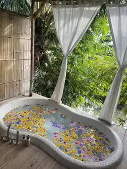 The decor is contemporary—incorporating bamboo and natural materials throughout, including bamboo walkways and bridges, country house structures, and rustic-style relaxation areas. There are both waterside and rooftop relaxation areas offering 360° views.