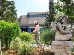 🐥 Luk Kai Khao Yai is a family-friendly restaurant in a European-style garden setting that blends perfectly with the Pak Chong district. The air-conditioned restaurant boasts a high, open ceiling and comfortable seating. The restaurant is divided into two sections: the restaurant and the souvenir section. The interior is adorned with trinkets, adding to the atmosphere and charm.