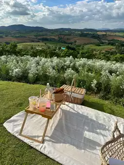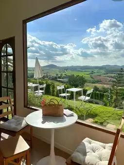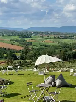A hidden cafe in Khao Yai, located on a hill with a beautiful view and a wonderful atmosphere, surrounded by nature. A cool breeze blows throughout the day.