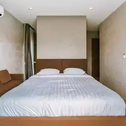 This villa can accommodate 4 guests. It has 2 bedrooms, 1 living room, a balcony with a large private pool, and a garden area for picnics or relaxing walks. The master bedroom is a good size with a comfortable bed. There's a work area behind the bed, and the end of the bed faces the pool, offering a stunning view from the foot of the bed. The other bedroom is located at the back, but doesn't have a view, but all rooms have en-suite bathrooms. The living room area features a sofa bed and a large Smart TV. However, there's no karaoke. The kitchen is located in the living room, fully equipped with cooking utensils, a refrigerator with an automatic ice maker, and a fully stocked minibar.