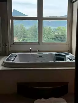 Check-in is at the Chateau building at the front. Note that there is no elevator, so you’ll need to use the stairs, which might not be ideal if you have a lot of luggage. We stayed in the "Chao Sua" room, a spacious 2-bedroom suite with high ceilings. The room felt a bit dated, but it featured Slumberland beds, a hairdryer, a refrigerator, and complimentary bottled water. The flooring is wooden, and the lighting is very dim, leaning towards darkness. The TV had very few channels, likely due to poor signal reception, and the air conditioning was somewhat tricky to adjust. The bathroom included a large jacuzzi tub and a private steam sauna.