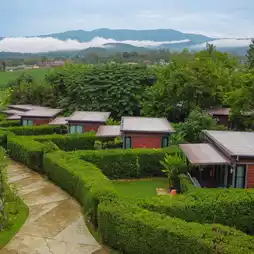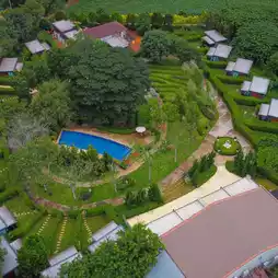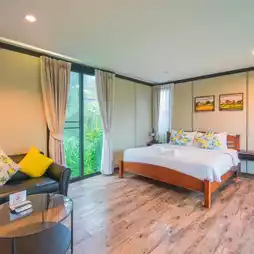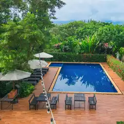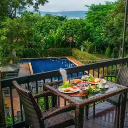 Amidst nature in Khao Yai, Limon Villa Khao Yai offers a warm European-style atmosphere with mountain views. It features two blue swimming pools and a flower garden for strolling, taking photos, and even cycling.