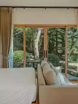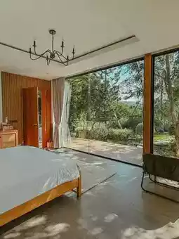 Designed in a minimalist style with a camping vibe 🏕️, it's surrounded by tall pine trees and lush green lawns 🌿, making you feel like you're staying abroad. It's especially pleasant if you visit in the morning or evening, where the air is cool and refreshing, allowing you to breathe deeply in the fresh air. 🍃