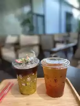 Timber Tale Cafe and Bistro: Passion Fruit Black Coffee and Peach Tea. Choose from a variety of sweet flavors. The restaurant features a garden area, artificial waterfall, and Khao Yai views. Choose from a variety of seating options to suit your preference.