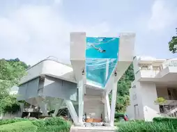The interior is elegant, with a swimming pool and a bathtub.