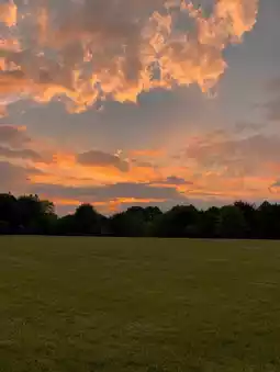 • A glass-enclosed cafe with green fields during the evening sunset.