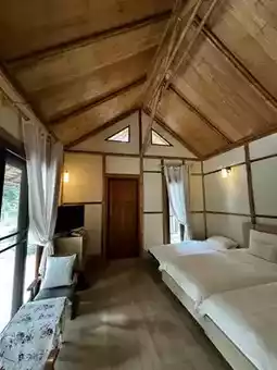 The hotel’s standout feature is its use of bamboo in the architecture, creating a warm and inviting atmosphere. The rooms are tastefully designed, combining rustic elements with modern amenities to ensure a comfortable stay. The bamboo furniture, earthy tones, and large windows bring nature indoors, making the experience both relaxing and refreshing.