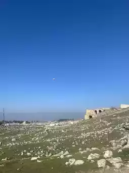 We landed in Istanbul in the morning and took a flight in the afternoon to Adiyaman Airport to travel to Kahta, a city in a high valley. After driving for 1 hour from the airport, we arrived at Karakus Tumulusu at around 5:00 PM. The sun was setting and the sky was pink and blue.