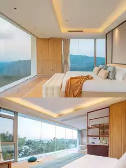 The overall architectural style combines modern and traditional elements, and the wooden structure inside gives a warm and simple feeling. Every room has a view of the sky and natural mountain scenery.