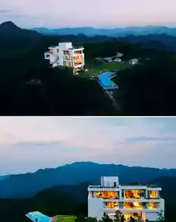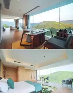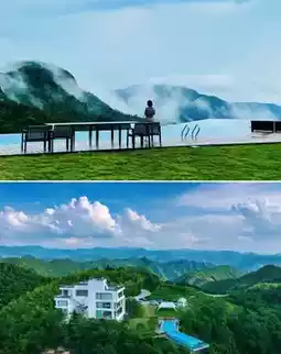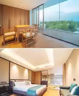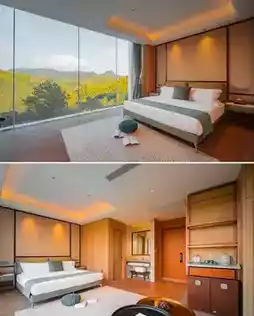 The pristine white structure blends into emerald tea fields, with floor-to-ceiling glass walls framing panoramic views of distant mountains, bamboo groves, and clouds—every window a living ink painting. The iconic cliffside infinity pool mirrors the sky; dip into cool mountain springs while overlooking the canyon for Insta-worthy shots! Zen-inspired common areas feature raw wood and bamboo weavings, with a tea platform suspended above the clouds—perfect for morning meditation.