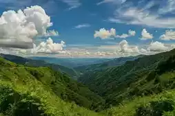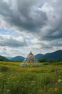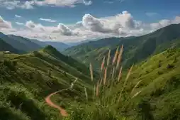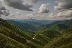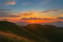 The summit is really beautiful, full of green meadows. You can see wind turbines in the distance. The wind is strong and very cool, like a natural air conditioner in summer.