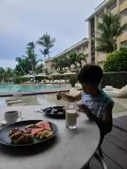 What stood out the most was enjoying breakfast while gazing at the stunning view of the outdoor swimming pool.