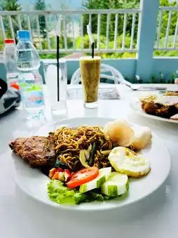 Lunch at Grand Tamaro Hotel’s poolside restaurant is where flavor meets view — a perfect blend of local warmth and natural beauty. With Lake Toba shimmering just beyond the edge of the pool, every bite of authentic Batak cuisine feels like a celebration of culture and comfort. From spicy sambal and grilled tilapia to fragrant rice and crisp vegetables, the meal pairs beautifully with the cool lake breeze and gentle splash nearby. It’s not just dining — it’s dining with a view that feeds the soul. 🍽️🌊