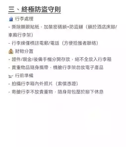 - Remove the conspicuous stickers and install a code lock + anti-theft chain (locked at the foot of the hotel bed/carriage luggage rack)