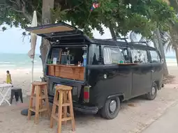 Volk Coffee is a classic mobile coffee shop where the owner has transformed a black Volkswagen van into a charming coffee spot by Thung Wua Laen Beach. They serve tea, coffee, and various beverages at affordable prices. There are seating areas where you can sip coffee while admiring the sea. The atmosphere is absolutely fantastic, incredibly relaxing, and unmatched in its chill vibe.