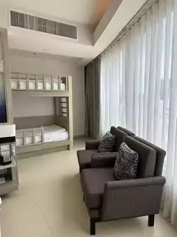 The room was very spacious, clean, and comfortable, with a high-tech feel. You don't need to insert a card, as the air conditioning and lights turn on automatically when you enter. The TV can be connected to your phone, which is very convenient for watching shows! 🔌 The pool was a family favorite, with slides for the kids. Even though there were many guests, there were plenty of lounge chairs. The gym is fully equipped and open 24 hours, which is great for fitness lovers! 🏋️