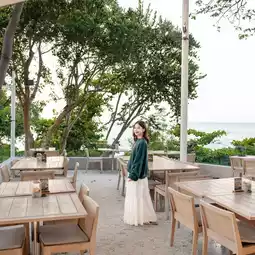 A beach club-style restaurant with a great atmosphere. The interior is decorated in a soothing white-cream color scheme with a beautiful sea view. The interior is shady and comfortable, perfect for chilling out or having a great dinner. The sunset view is so beautiful in the evening.