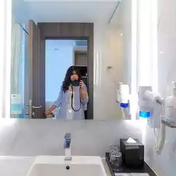 As for the rooms, they are simply decorated, clean, in blue and white tones. The room size is just right, not cramped. The bed is soft and comfortable. The pillows are fully equipped with amenities, including a TV, work desk, refrigerator, hot water kettle, water heater and hair dryer. As for the facilities, there is a swimming pool and a fitness center that is open 24 hours. As for breakfast, it is a buffet line with a variety of menus to choose from. There is also a Grab & Go breakfast service for those who are in a hurry to go to work.