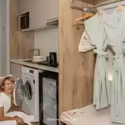 This room has a bathtub inside with see-through glass. 😁 But if you want privacy, you can press the switch to turn it blackout. Hehe. The bed is very soft and comfortable. I also like that there is a kitchen area. Washing machine ready Suitable for those who want to come and relax for a long stay as well.
