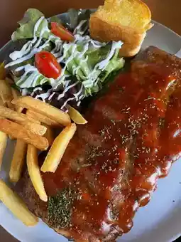 It can be said that it is both worthwhile and delicious, the pork steak is soft, the spinach baked with cheese is delicious, the spaghetti is also good, the burger is good. Let's do it like this. It comes in a Portion that can be called beyond the price, cheap and good quality!
