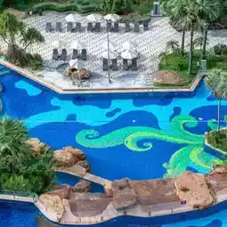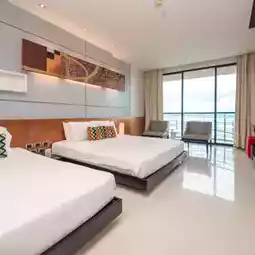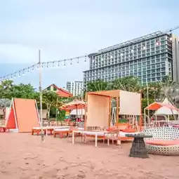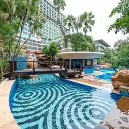 A beachfront hotel in Pattaya with a very large swimming pool and a beautiful sandy beach.