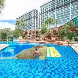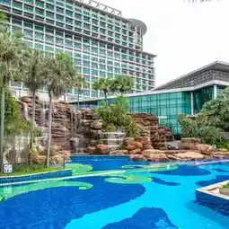 There is a magnificent giant waterfall on the swimming pool.