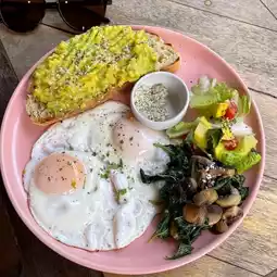 The cafe is beautiful and the service is good, prices and quality are good. We started with shots of pressed ginger & soda and a vitality & soda! Loved these drinks! We shared the focaccia with dukkah, the hummus, tomato salad with yogurt & cardamom dressing.