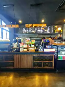 The interior of the shop is curved glass on all sides, decorated with wooden furniture, creepers and beautiful lamps. The warm light tone matches the brown seats, giving a warm feeling, suitable for relaxing.
