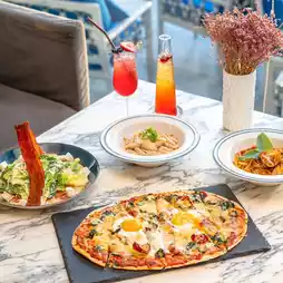 There are both air-conditioned and outdoor areas to enjoy the breeze and watch the sunset.
