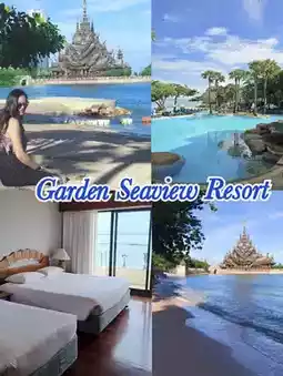 🏖️ Garden Seaview Resort, private beachfront accommodation in Bang Lamung area. You can walk and play in the sea. You can see the Sanctuary of Truth. If you stay here, you will see 2 views: the left side of the sea is the beach. And the right side of the sea is not a beach, it is a rocky beach and a beautiful, shady garden. You can see the view of the Na Kluea fishing pier.