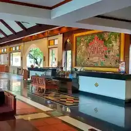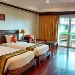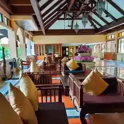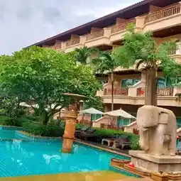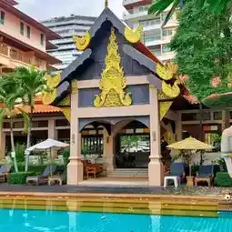 Inside the resort, it is peaceful and shady, surrounded by various trees, creating a green and relaxing atmosphere. The decoration emphasizes Thai style, and there is a large swimming pool in the center of the resort.