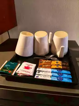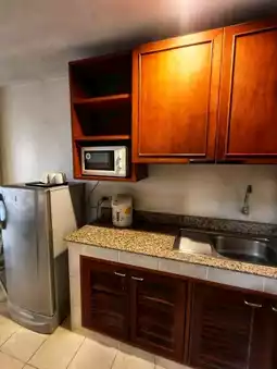 We booked a room for 3 people. Inside the room are 3 single beds for 3 people. There is a small kitchen, sink, microwave, refrigerator, and cups and plates. New and clean, very convenient.
