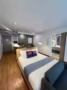 - The room is spacious, has a sofa, a table and chairs to sit and eat.