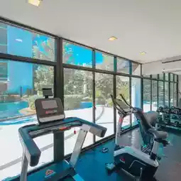 The hotel facilities are comprehensive, including a fitness center and swimming pool. The pool area is particularly lush and serves as a picturesque spot for photography.
