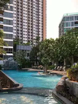 There are 2 swimming pools here, one on the ground floor and one on the middle floor of the condo. We like the lower pool, quite beautiful.