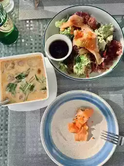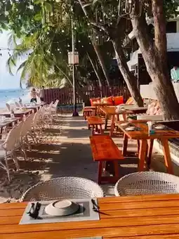 At five we drifted up to Surf & Turf’s tables. While they were serving drinks, I was able to change my clothes in WC, no one said anything. Think hanging rope swings, pastel cushions and English-speaking staff who actually smile. Dinner was a knockout: salmon ceviche-style salad, fiery tom yam, stretchy-cheese pizza and two strong cocktails—easily some of the best seafood I’ve had in Thailand. The pièce de résistance? Watching a fire-orange sunset with feet still in the sand. Waves, music, zero city noise—perfection.