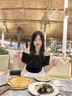 🦞 Let's talk about food and drinks. Here, there are many menus to choose from, including Thai food, Western food, and fresh seafood. Fern ordered pizza and spaghetti to try.