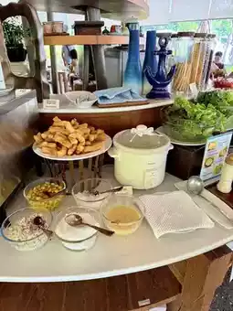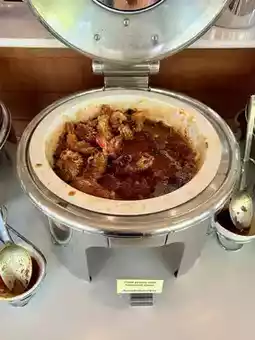 The first thing that made us think, "Wow, we have to come here," is the Tamarind Sauce Shrimp. Once you taste it, you'll find it incredibly delicious—so good that we went back for three servings! It's definitely worth coming back for. The variety of food is also remarkable: Tamarind Sauce Shrimp, Stir-fried Ribs in Sauce, Pasta, Stir-fried Beef in Sauce, Roti, Bread, Cornflakes, Chinese Doughnuts, Eggs, Stir-fried Noodles, Fruits, Cakes—you name it! There's so much to try that it's impossible to list everything. You should come and experience it yourself. But the first thing you must try is the Tamarind Sauce Shrimp. It's the No.1 dish 👍. A must-try!