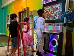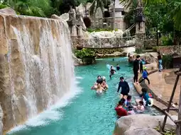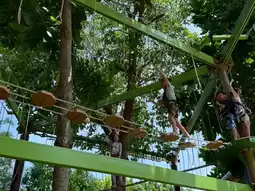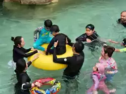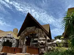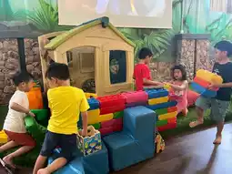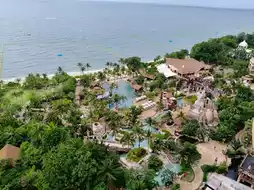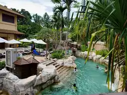 The grand swimming pool and kidzone are packed with toys. This was my first visit here, and I was truly impressed. The hotel is stunning, surrounded by nature, and incredibly spacious. There are so many activities that you don’t even need to go anywhere else. The swimming pool is massive, with a kids' pool about 120cm deep. The water is quite cool and flows continuously through waterfalls, bridges, and tunnels. The hotel provides free inflatable rings for guests to use, and there are multiple levels of fun. The main pool is heated, with shallower areas near the edges and deeper sections as you move inward. At the top, there’s a cliff diving spot, and the slides here are spectacular—tall and super fun! The hotel is huge and located by the sea, which the kids absolutely love. The private beach is great too. The kids' club is part of the Lost World area and offers both free and paid activities. Free outdoor activities include trampoline jumping, sand play, and climbing, while the indoor air-conditioned area features coloring, movie watching, building blocks, and arcade games (which require 10-baht coins). Paid activities include zip-lining and rope climbing.