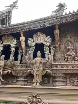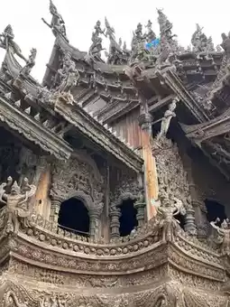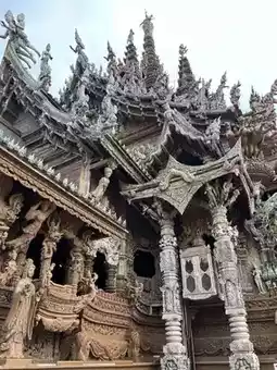 Constructed entirely out of teak wood without any metal nails, the sanctuary combines elements of traditional Thai, Khmer, Chinese, and Indian architecture. Every inch of the building is covered with intricate wood carvings that reflect themes from Buddhism and Hinduism, as well as universal truths about human life, nature, and the cosmos.