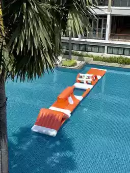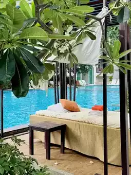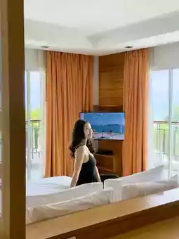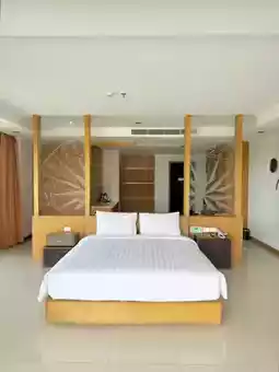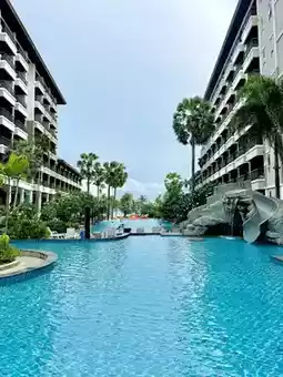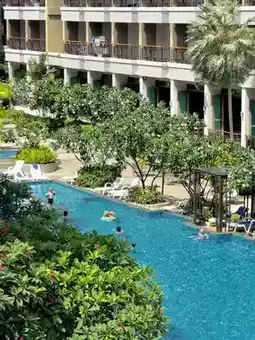 This accommodation near Dongtan Beach, Pattaya, offers an amazing atmosphere🏖️. You can enjoy stunning sunset views and relax in one of the three swimming pools💦. There are various room types to choose from, and this time we stayed in the Suite Corner room. The room is spacious, featuring a balcony with a view, a Jacuzzi for soaking🛁, a sofa for lounging, and a desk for working🛋️.