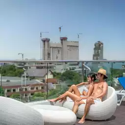 The top floor features an outdoor swimming pool with sea views. Sunbeds are provided around the pool. Next to the pool is a bar serving food and drinks.