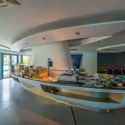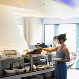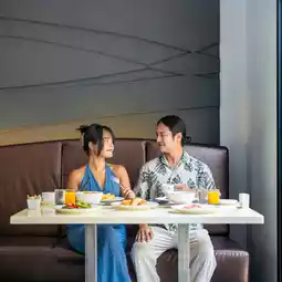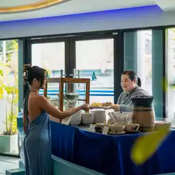 Breakfast is served buffet-style. The restaurant is located on the ground floor, near the lobby. The food selection is quite extensive. We offer a selection of Thai and international cuisine.