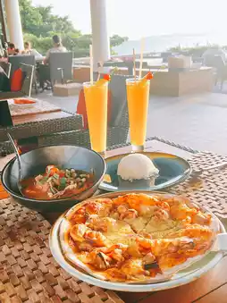 We ordered two mango smoothies, a seafood pizza, and Tom Yum Kung tiger prawn soup. Each dish was generously portioned and tasted excellent. This vacation allowed us to enjoy both delicious food and stunning scenery, making it truly relaxing.
