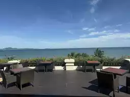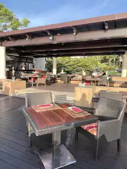 Dinner at dusk in an open-air setting without air conditioning. Initially, we planned to sit under the covered area, but it felt a bit warm inside. Stepping outdoors, we found a gentle breeze that made it cooler and more comfortable, with a better ambiance. As the sun sets, the sky turns a beautiful shade of purple, creating a serene and picturesque view. If you prefer outdoor seating, it's recommended to book in advance or arrive early.